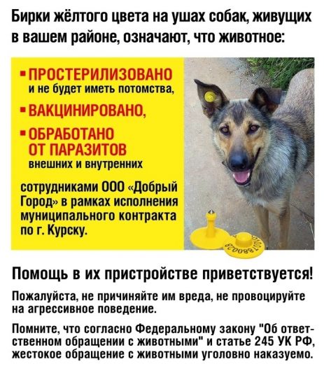 В Курске стабилизируется ситуация с отловом безнадзорных животных по программе ОСВВ («Отлов-Стерилизация-Вакцинация-Возврат»). По договору подрядчика теперь работают зоозащитники и волонтеры организации «Добрый город». Ими уже отловлено 29 собак. 12 — вернулись на улицу с отличительными желтыми бирками в ушах.