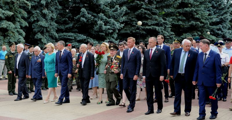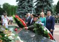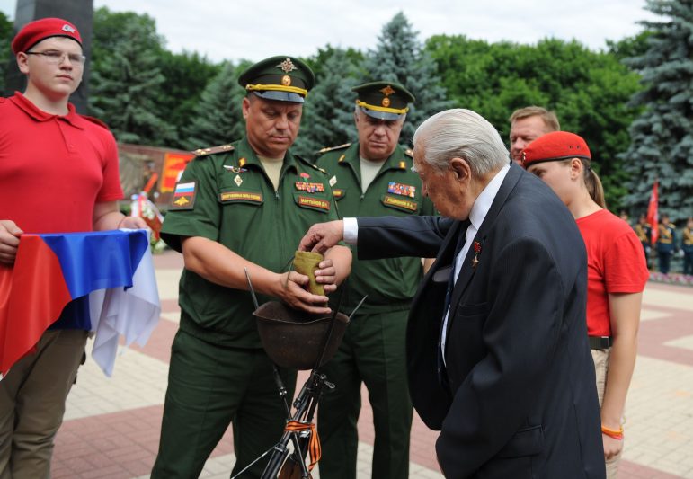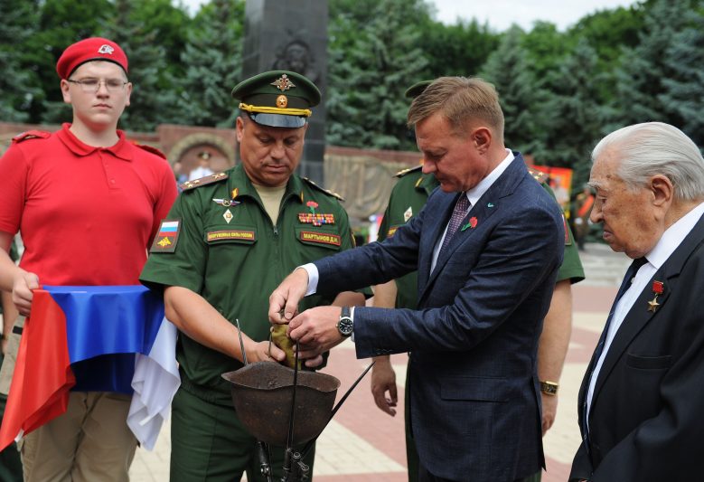 В 9 часов утра Курск присоединился еще к одной акции — «Горсть Памяти». В торжественной обстановке с места воинского захоронения на Мемориальном комплексе «Памяти павших в Великой Отечественной войне 1941-1945 годов» была взята земля и пересыпана в солдатский кисет.