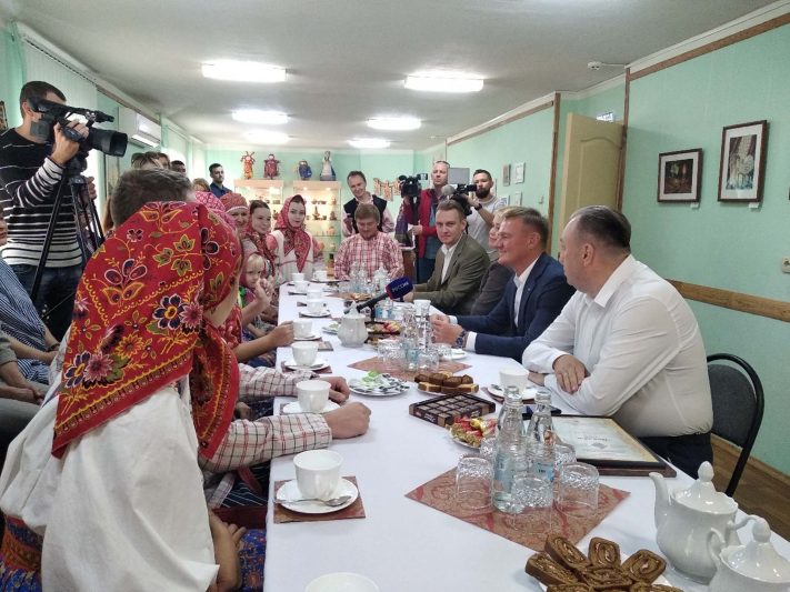 Глава региона быстро обошел совсем небольшой по размерам Дом народного творчества и общение продолжилось за чашкой чая. Анна Кунавина рассказала, что коллектив был создан при ОДНТ еще в 1993 году, состав его менялся, но, как и прежде, в нем не так много тех, кто имеет музыкальное образование. Это любители, причем горожане, люди разных профессий, которых объединяет любовь и бережное отношение к народным традициям.