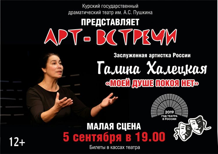 5 сентября в рамках проекта «АРТ-ВСТРЕЧИ» на малой сцене Курского драматического театра имени А.С. Пушкина состоится встреча под названием «Моей душе покоя нет» с заслуженной артисткой России Галиной Халецкой.
