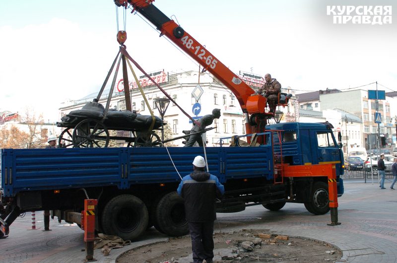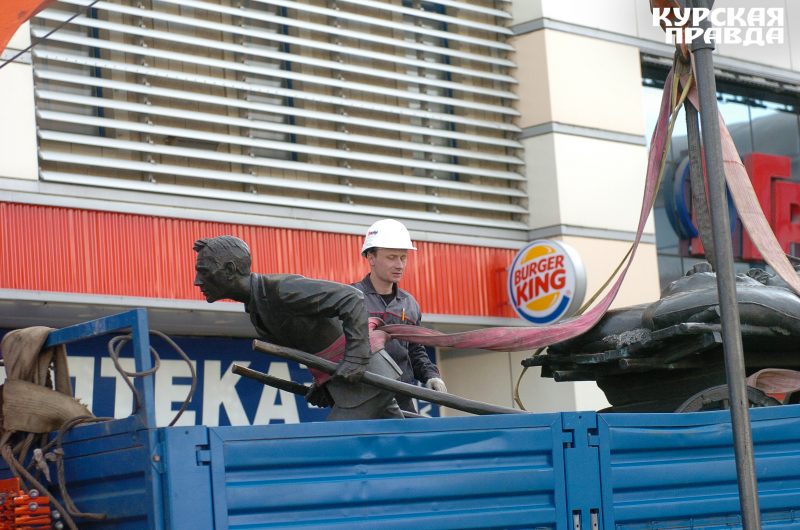 Сегодня, 11 октября, в 13:00 на площадке возле торгового центра «ГриНН» скульптура «Современного предпринимателя» была демонтирована и погружена для отправки в город Орёл.