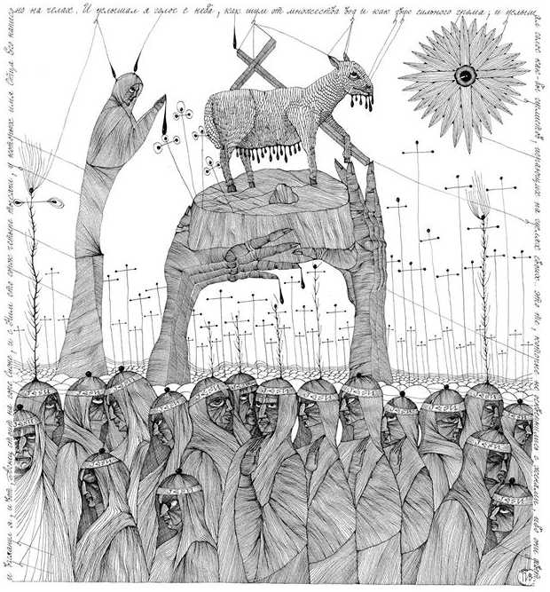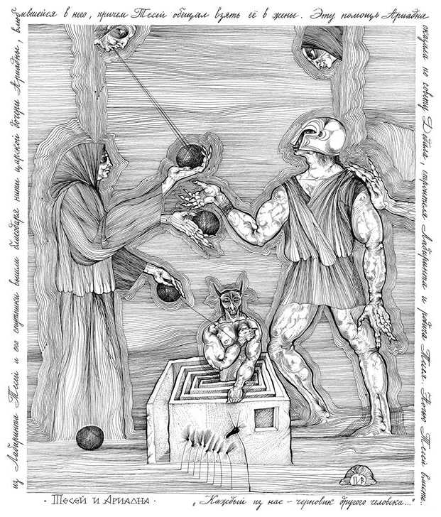 Работы Пичикова необычны. Написанные тушью и пером, они отразили темы жизни, смерти, любви.
