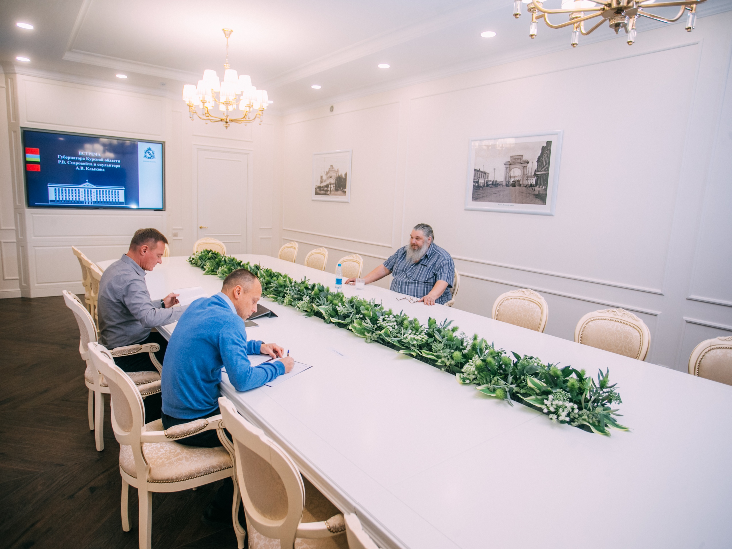 Губернатор Курской области Роман Старовойт в рамках рабочей встречи обсудил со старшим старшим сыном Народного художника России Вячеслава Клыкова скульптором Андреем Клыковым возможность установки в Курской области новых памятников и скульптурных композиций.