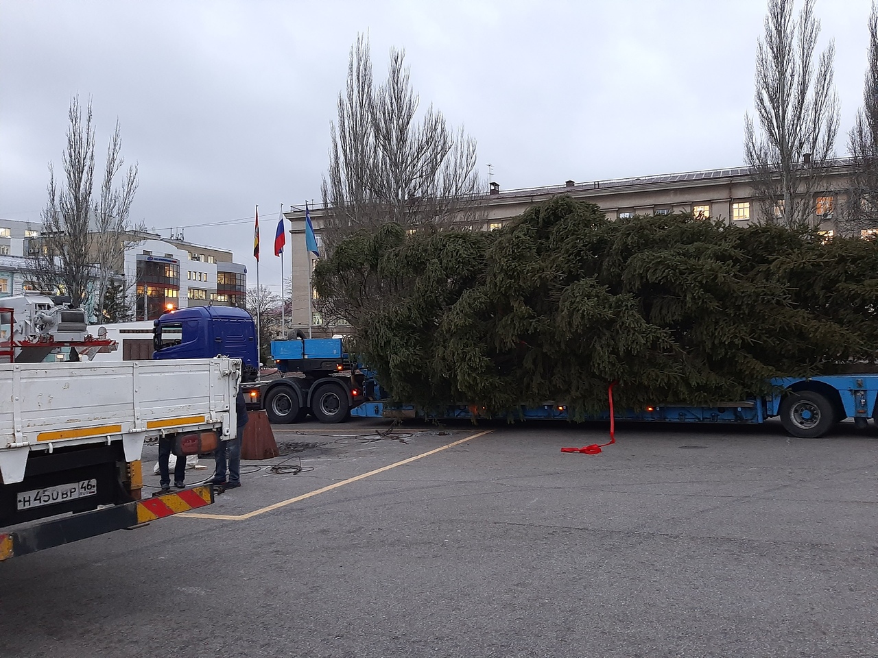 В Курске на Красной площади начали устанавливать новогоднюю елку. Как сообщили в мэрии, высота дерева — 18 метров, размах нижних ветвей – 10.
