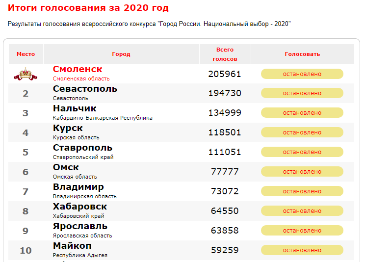 Миллионы россиян весь год делали свой выбор. По итогам голосование первое место, с большим отрывом, занял Смоленск. Он узнаваем и популярен у 205 тысяч человек. На втором месте – город Севастополь, набравший 194 тысячи голосов. Третье место 134 тысячи человек отдали Нальчику.
