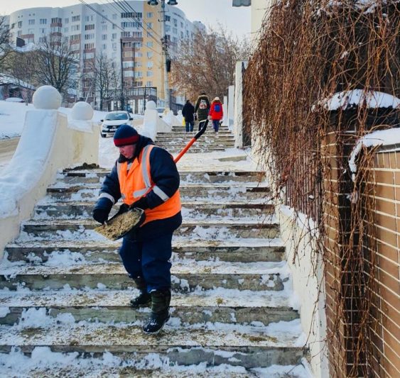 В Курске приводят в порядок лестничные спуски: очищают от снега и посыпают песком.