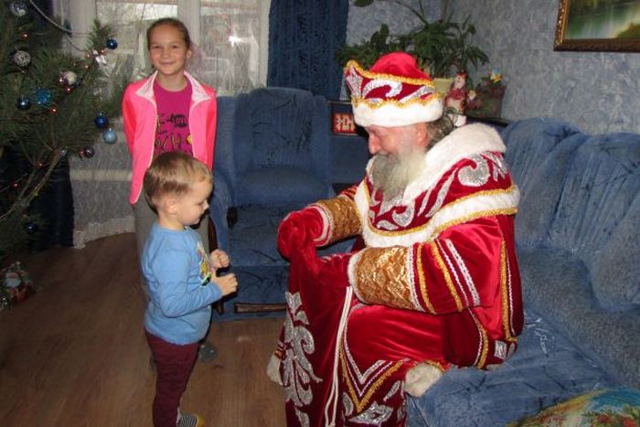 Батюшка в костюме хозяина Нового года посетил многодетные семьи и семьи, оказавшиеся в трудной жизненной ситуации, поздравил их с Рождеством Христовым, рассказал об истории и смысле праздника и вручил ребятишкам сладкие подарки.