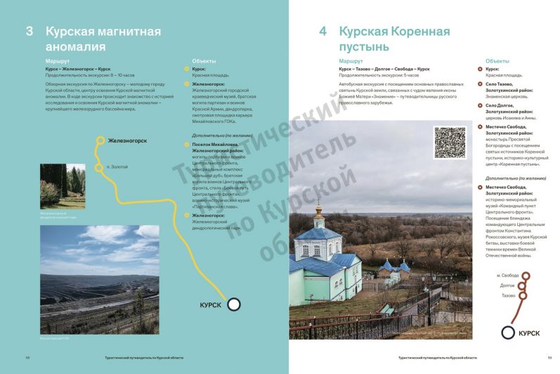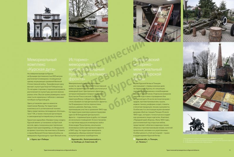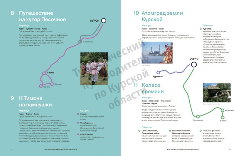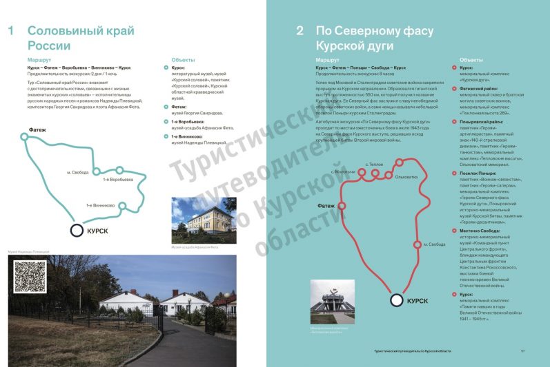 Такой путеводитель выпустил региональный комитет по культуре и Туристско-информационный центр. В справочнике вы узнаете, где можно остановиться в Курской области, отдохнуть, поесть. Узнаете о памятниках, усадьбах, мемориальных комплексах, музеях, концертных залах, примечательных природных объектах, гастрономических брендах края.