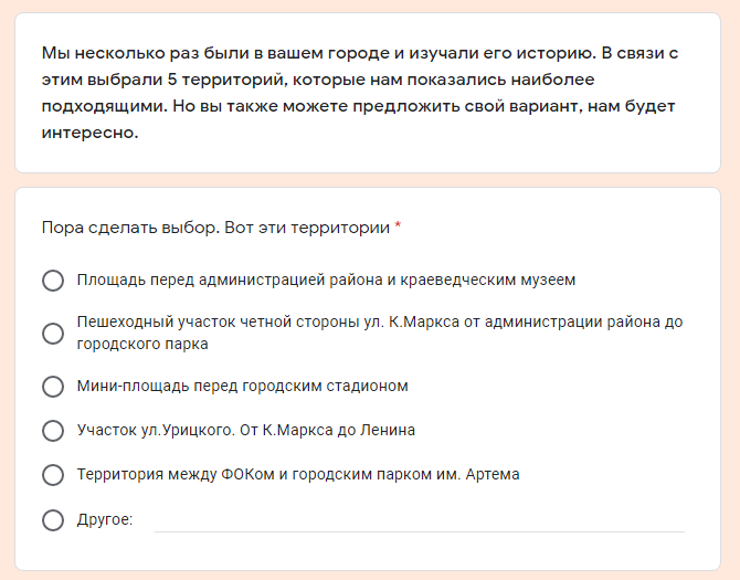 которые наиболее подходят под условия конкурса. Это площадь перед администрацией района и краеведческим музеем, пешеходный участок улицы К. Маркса от администрации района до городского парка, мини-площадь перед городским стадионом, участок улицы Урицкого: от К. Маркса до Ленина, территория между ФОКом и парком имени Артёма.