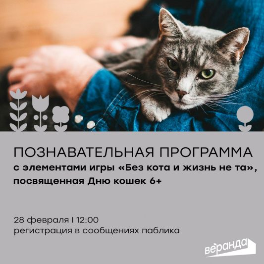 28 февраля в креативном пространстве «Веранда» пройдёт познавательно-игровая программа «Без кота и жизнь не та». Она посвящена международному Дню кошек.