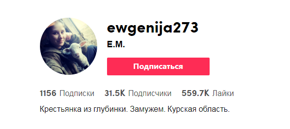 Летом прошлого года Женя (ewgenija273) начала записывать ролики о сельской жизни и публиковать их в социальной сети TikTok. Простые и забавные ролики милой девушки, которая с юмором рассказывает о домашних хлопотах, пришлись интернет-публике по вкусу. Сегодня у неё уже более 500 тысяч лайков и 30 тысяч подписчиков.