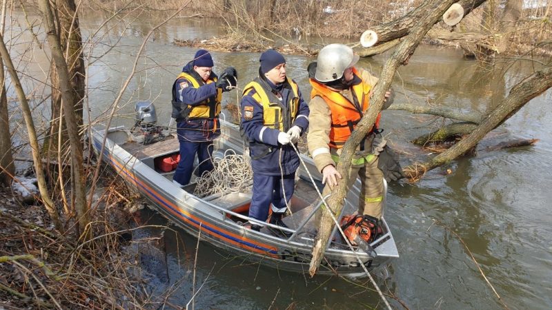 Сегодня курские спасатели расчищают протоку Кривец от бревен и мусора, скопившихся за зиму около школы №16 .