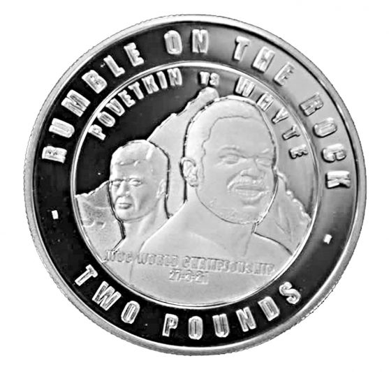 На монете написано: «Rumble on the Rock» («Сражение на Скале» – слоган поединка) и «Поветкин против Уайта». Также там есть изображение боксёров: на первом плане – Уайт, позади – Поветкин.