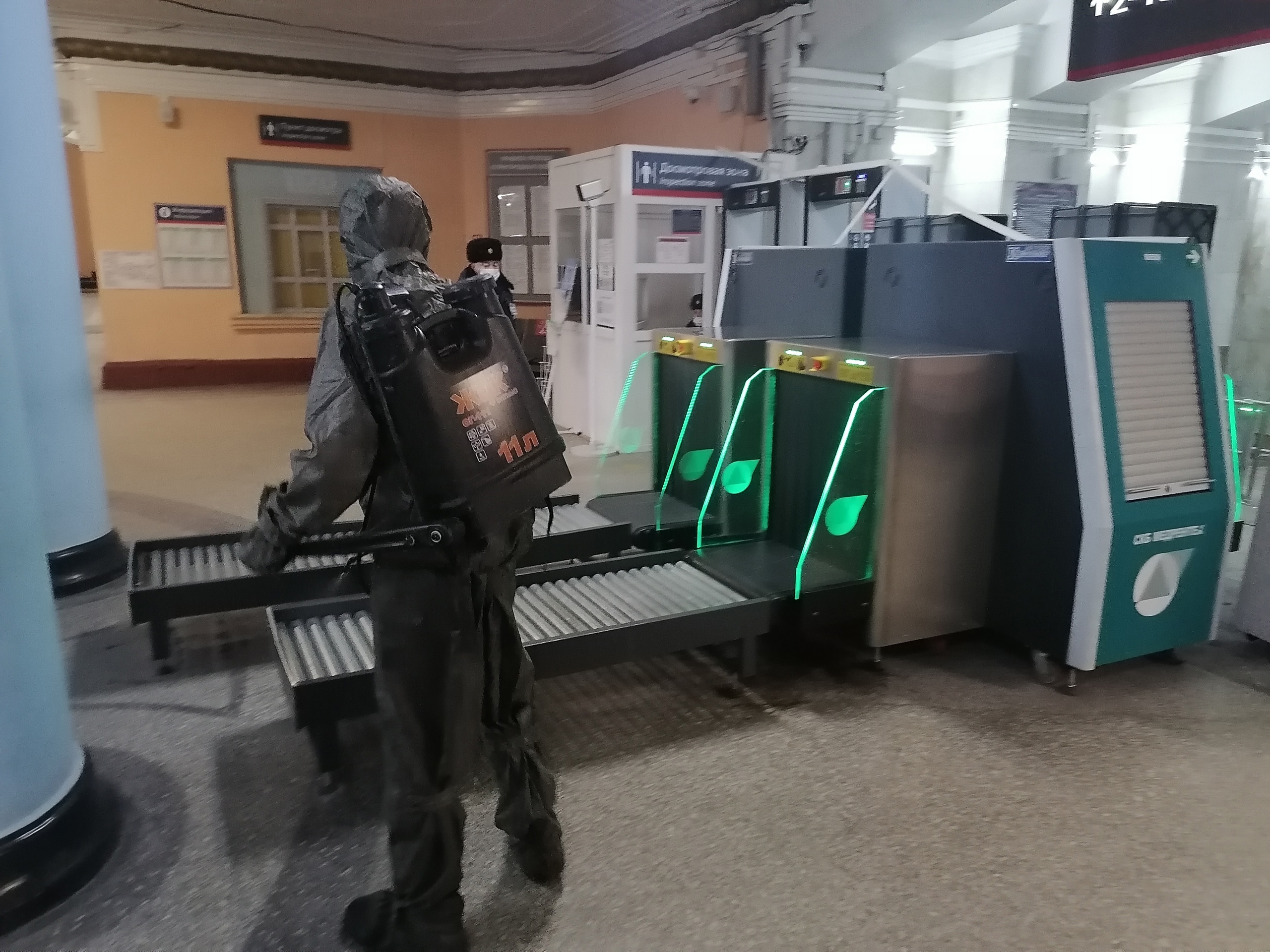 Сегодня дезинфекция прошла на Железнодорожном вокзале города. Дезинфицирующий раствор уничтожает опасные вирусы и не несет опасности для человека и животных.
