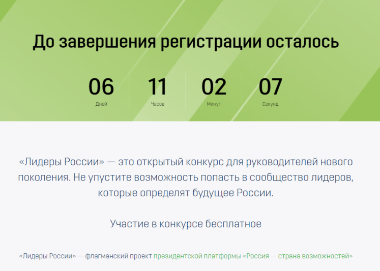 26 апреля в 23.59 на сайте ЛидерыРоссии.рф закроется регистрация на четвёртый конкурс управленцев «Лидеры России» – проект президентской платформы «Россия – страна возможностей». Конкурсантам необходимо заполнить биографическую анкету и загрузить видеоинтервью в личный кабинет.