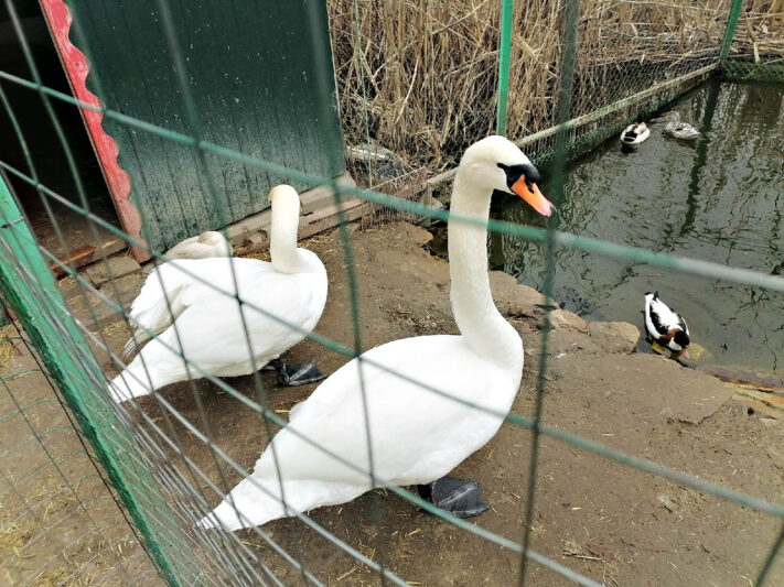 Недалеко от входа плавают в воде два лебедя – Беляш и Парус. Самочку нашли в гнезде глушковские грибники. Она, обессиленная, высиживала пустые яйца-болтуны.