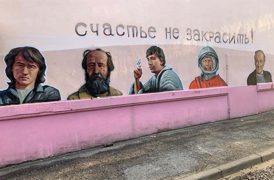 На Ленина, 90/1, в Курске в ноябре прошлого года сделали граффити с портретами известных личностей СССР и России.