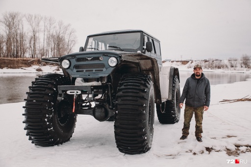 и десять его друзей. Им понадобились новый UAZ Hunter, стандартный 135-сильный мотор, коробка передач от ГАЗ-53, раздаточная коробка от БТР и мосты от ГАЗ-66. Гигантские шины взяли от вездехода «Тром-16».