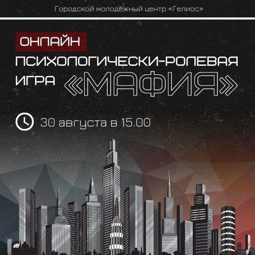 30 августа в 15:00 мирные жители постараются побороть атаковавшую город мафию. Курский «Городской молодёжный центр «Гелиос» проведёт онлайн-турнир по психологически-ролевой игре.