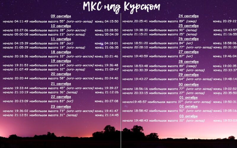В таблице — даты и время видимого пролета МКС над Курском. Пролет занимает в среднем 2,5 минуты. Например, вечером 22 сентября МКС появится над Курском в 20:23:09 на юго-западе, а в 20:27:08 скроется на востоке. К наблюдению лучше подготовиться заранее, советуют в Курском планетарии.