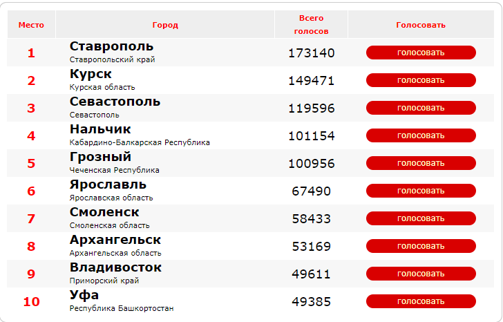Курск занимает 2-е место почти со 150 000 голосов. На первом месте Ставрополь, у которого 173 000 голосов. Всего в соревнованиях приняли участие свыше 80 городов.