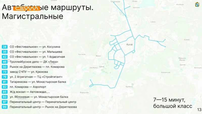 Магистральные маршруты соединят основные густонаселенные районы города с центром и между собой. Здесь будут автобусы большой вместимости.