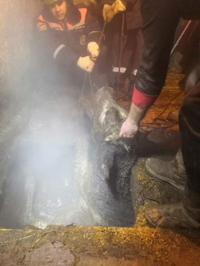 – Полы в коровнике из-за влажности и ветхости прогнили и не выдержали веса быка, который провалился в яму глубиной около 1,5-2 метров. Помещение было очень тесным, использовать лебёдку из-за конструктивных особенностей строения не получилось, – рассказал старший смены спасателей Алексей Никуличев. – Поэтому мы вырезали часть пола, подложили щиты, обвязали животное канатами и силами наших сотрудников и двух местных жителей вытащили быка.