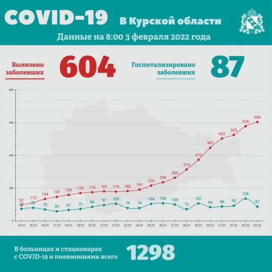 Заболеваемость коронавирусом в Курской области растет. Сегодня, 3 февраля, в регионе зафиксирован максимальный суточный прирост. За прошедшие сутки тест на коронавирус оказался положительным у ещё 604 курян.