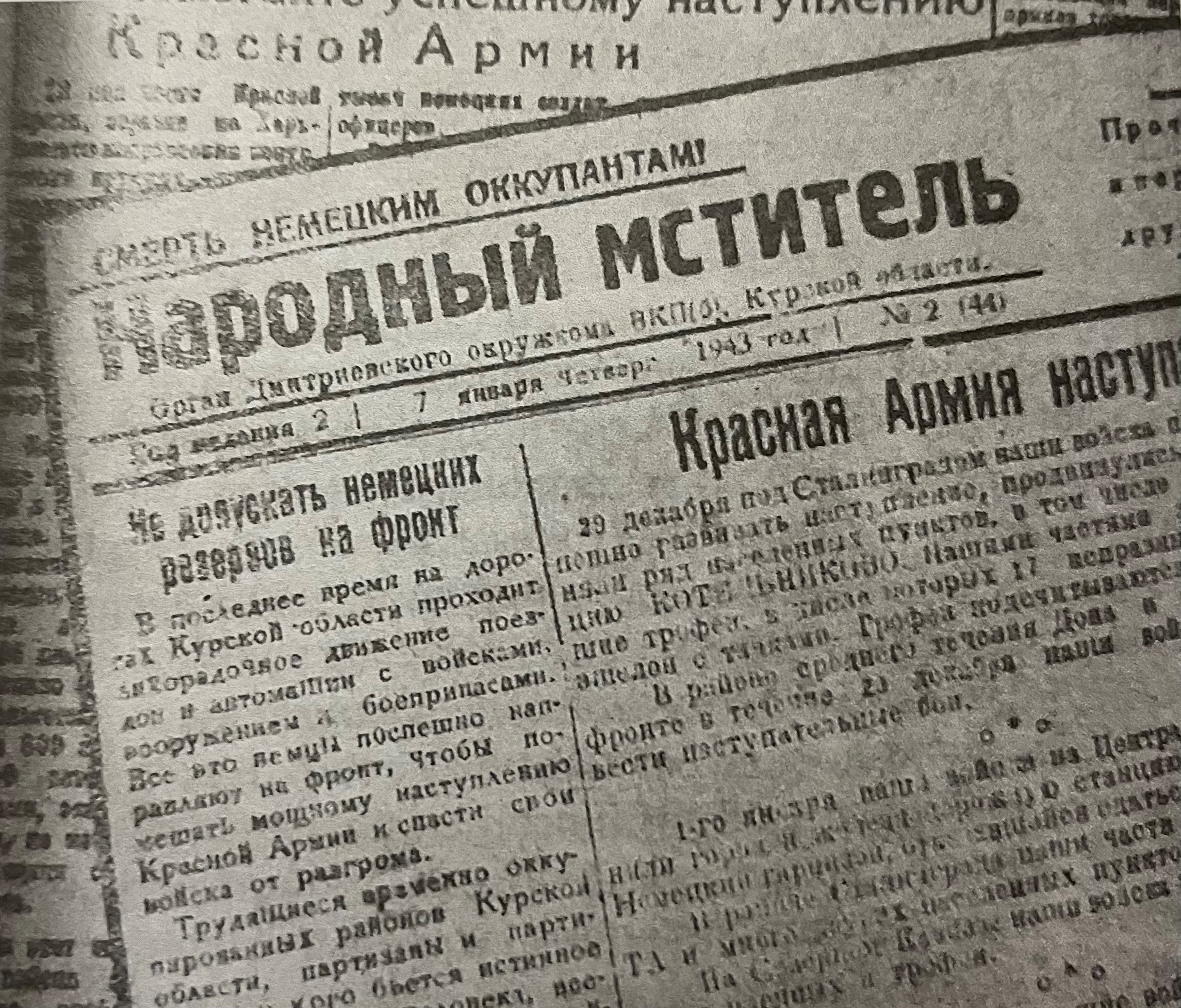 Осень 1942 года для партизан была очень тяжёлой. Карательные отряды немцев по численности намного превосходили дмитриевский отряд. Но уже в конце октября в отряд доставили типографское оборудование, бумагу, краску. Прибыли и специалисты-печатники. В канун нового 1943 года вышел первый печатный номер газеты «Народный мститель». С этого момента до мая 1943 года она выходила регулярно…