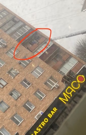 Мужчина находится на карнизе балкона 5-го этажа. На месте скорая, пожарные и МЧС.