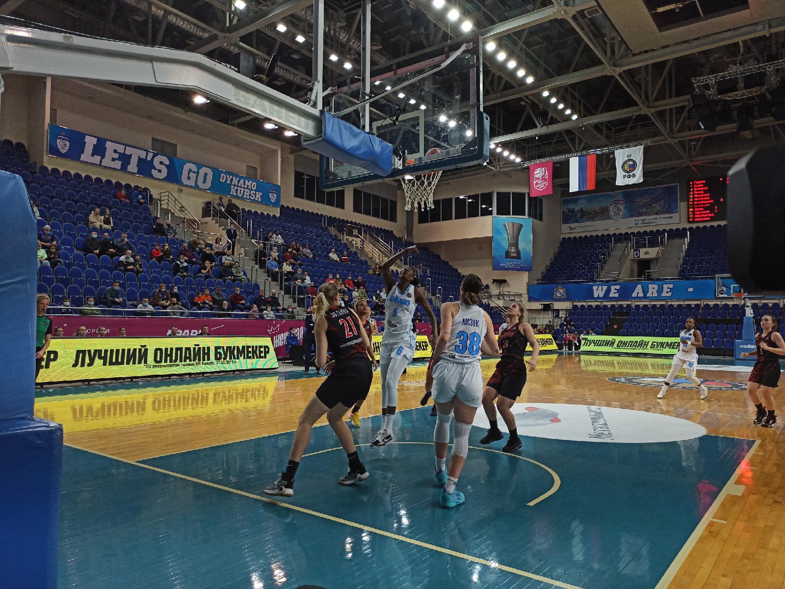 В спортивно-концертном комплексе Курска состоялась встреча регулярного этапа чемпионата России по баскетболу среди женских команд, в котором местное «Динамо» принимало гостий из Видного – «Спарту энд К». Дебютный игрой отрезок остался за видновчанками – 16:14. Во втором периоде хозяйки мощно атаковали из-за дуги — с набором очков из «краски» дела шли неважно. Как итог — 5 дальних попаданий за 10 минут и перевес в счёте 29:19. В начале третьей четверти хозяйки после попадания Огунбовале повели «+10». Видновчанки не дали сопернику развить успех.
