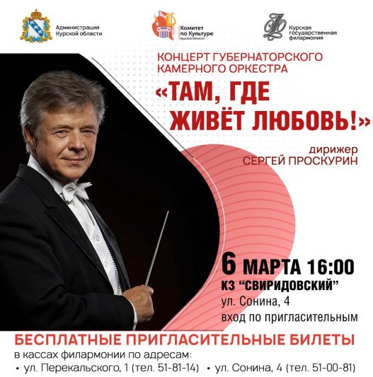 Сегодня, 6 марта, в концертном зале «Свиридовский» пройдёт концерт Губернаторского камерного оркестра под руководством дирижёра Сергея Проскурина. Программа называется — «Там, где живёт любовь!». Куряне услышат композиции из известных кинолент: Love Story, «Аромат женщины», «Миссия», «Игра престолов».