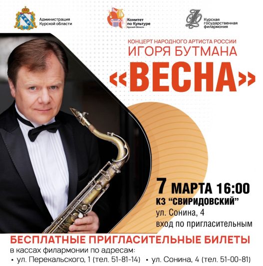 7 марта в «Свиридовском» состоится концерт народного артиста России Игоря Бутмана и джазового квинтета. В программе «Весна» прозвучат авторские композиции и любимые публикой мелодии.