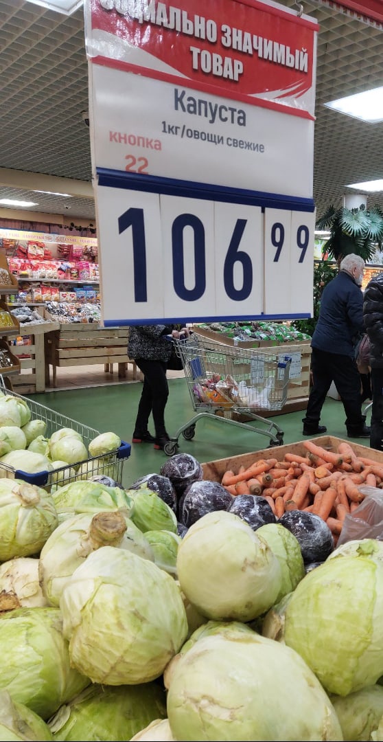 Горожане стали выкладывать фотографии с ценами на крупы и овощи из «борщевого набора» в местных пабликах в соцсети «ВКонтакте». Так, килограмм гречки в торговой сети «Европа» стоит сейчас почти 105 рублей, риса — почти 110 рублей. В «Линии» цена на свежую белокочанную капусту составила без копейки 107 рублей за килограмм.
