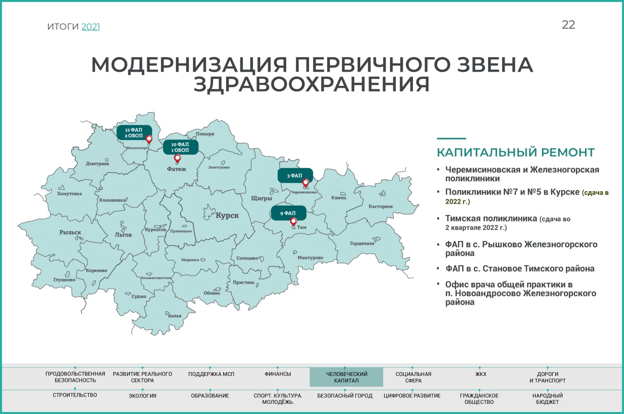 В планах на 2022 год строительство еще 27 ФАПов и -2х офисов общей врачебной практики, капитальный ремонт 5-ти фельдшерско-акушерских пунктов и 5-ти поликлиник. Планируется приобрести 10 единиц оборудования и 19 автомобилей.