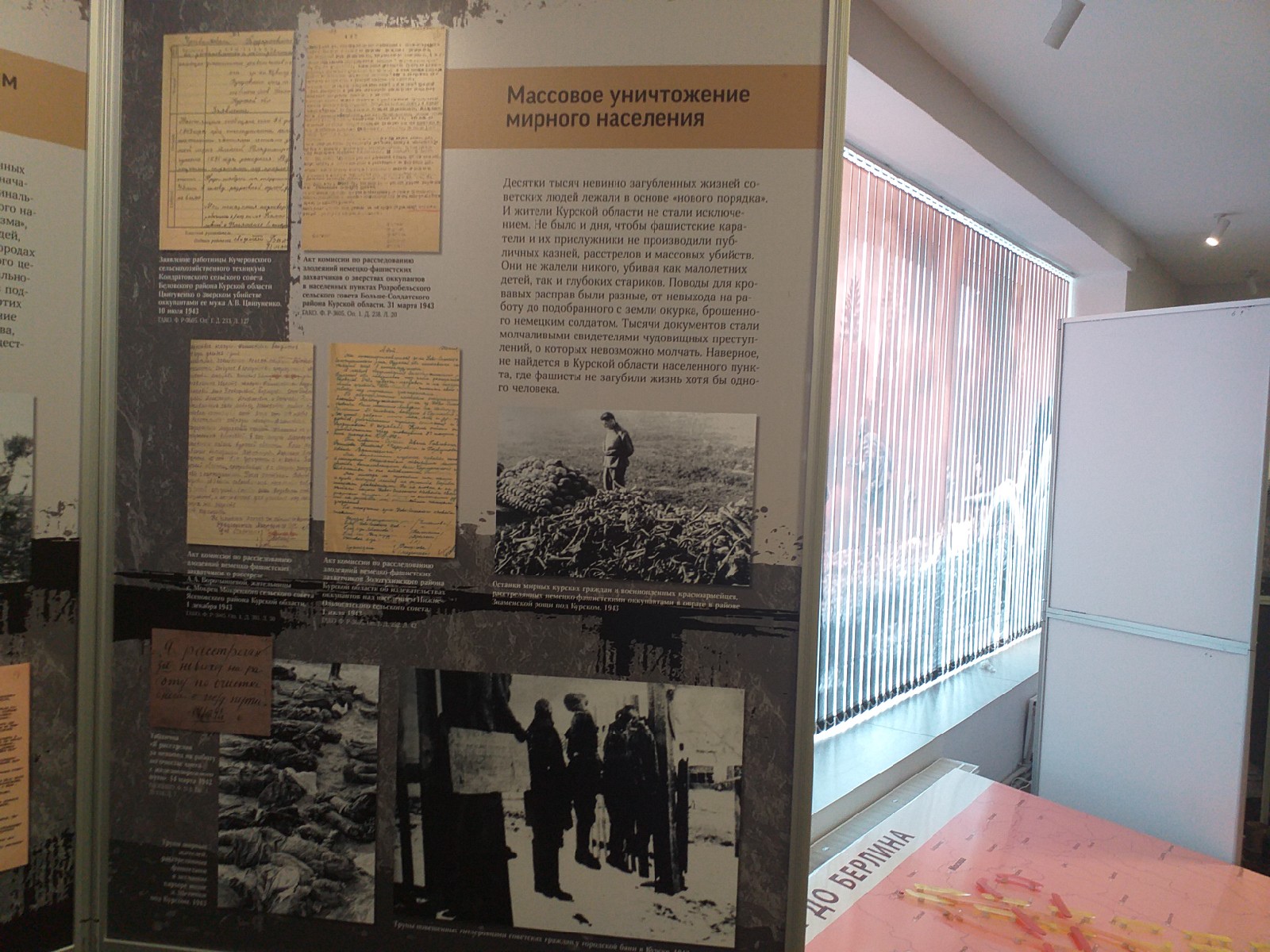 В подготовке выставки участвовали курские учёные и студенты. Они отобрали 10 тысяч архивных документов. Один из них был оглашён на Нюрнбергском процессе. Это трагедия психиатрической больницы в Сапогово, где в декабре 1941 года отравили более 1,4 тысячи пациентов.