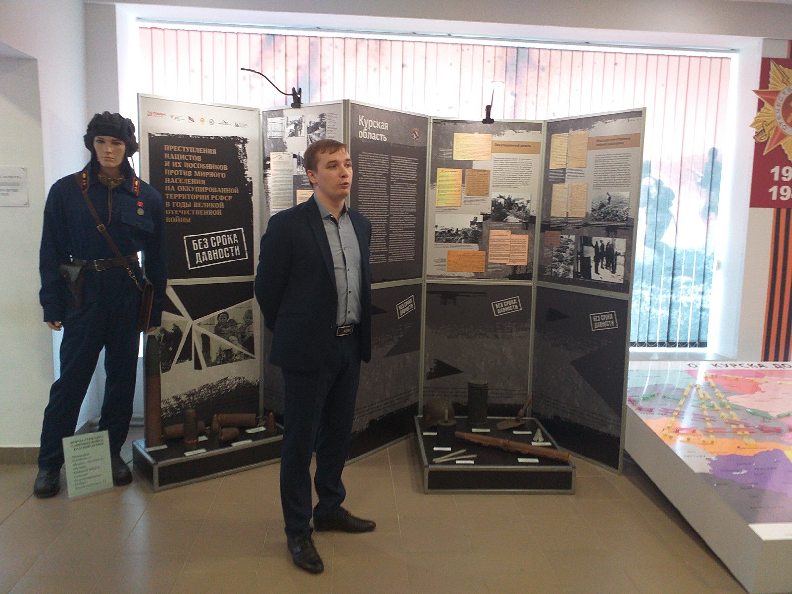 В выставочном центре «Курск – Город воинской славы» прошла экскурсия для студентов «Без срока давности: Преступления нацистов и их пособников против мирного населения на оккупированной территории РСФСР в годы Великой Отечественной войны». Здесь представлены уникальные документы о зверствах фашистов в годы оккупации. Среди них объявление коменданта Рыльска капитана Тамке. Суть его в том, что за обрезанный военный телеграфный провод расстреляют пять заложников, если диверсанта не обнаружат.