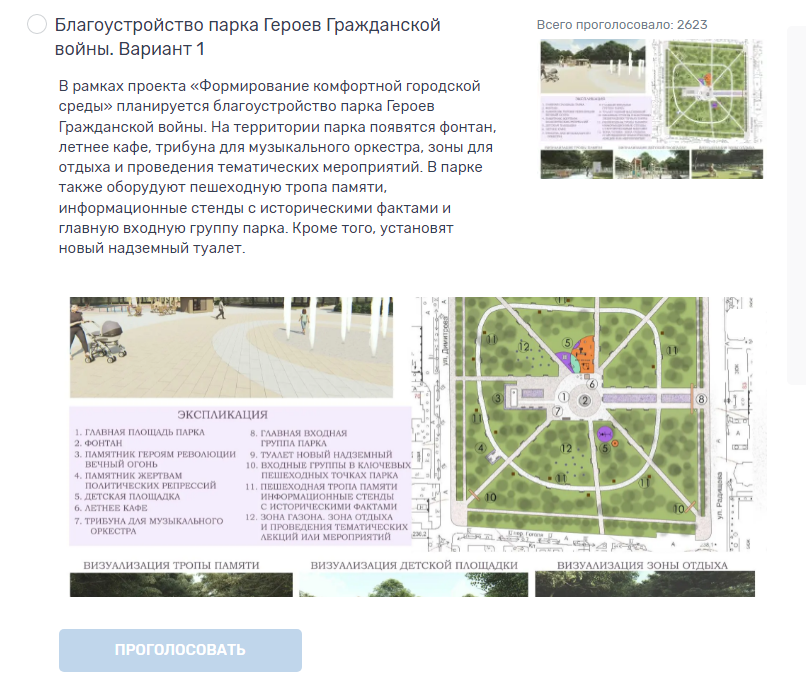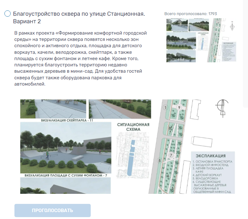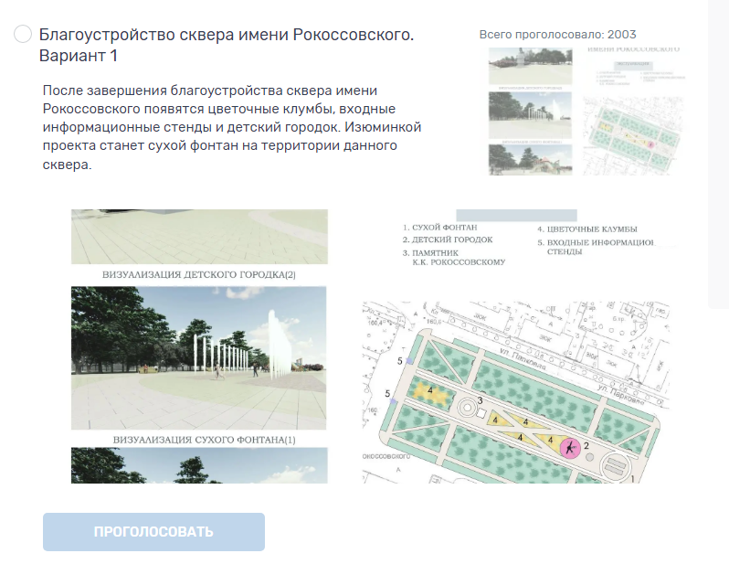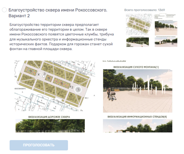 В Курске планируют преобразить парк Героев Гражданской войны (в народе — Бородино), скверы на площади Рокоссовского и улице Станционной. В Курчатове будут благоустраивать участок около Доски почёта на Коммунистическом проспекте, пешеходную зону по улице Садовой, территории по улицам Ленинградской и Строителей. В Железногорске горожане решают, каким станет Сквер воинской славы. Для каждого объекта подготовлено по два дизайн-проекта.