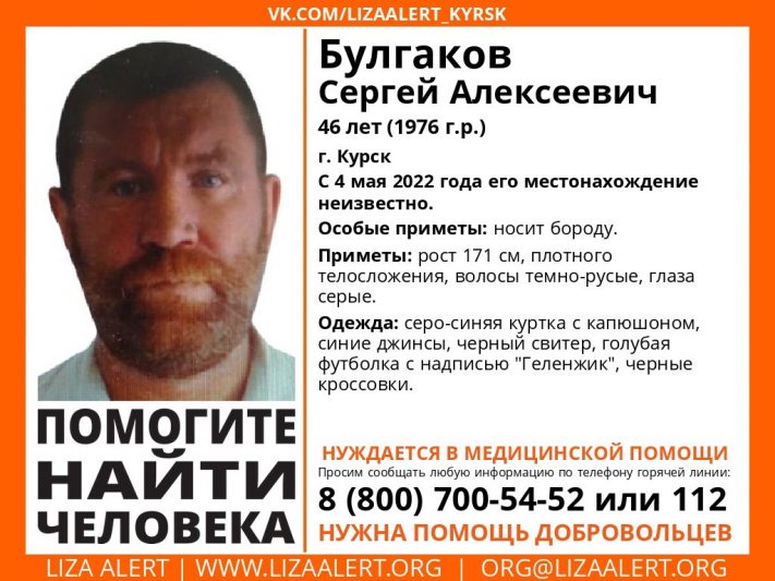 О местонахождении мужчины ничего не известно с 4 мая 2022 года. Курянин нуждается в медицинской помощи.