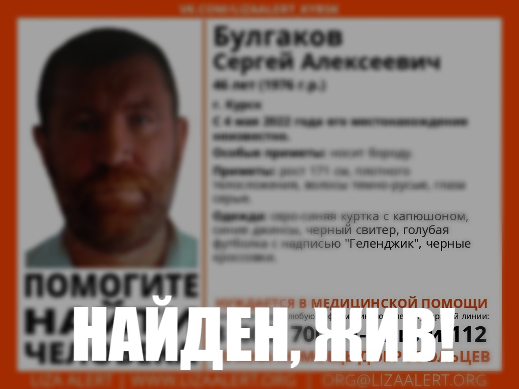 46-летнего Сергея Булгакова, одетого в голубую футболку с надписью «Геленджик», в Курской области искали с 4 мая. Напомним, мужчина нуждается в медицинской помощи, поэтому на его поиски незамедлительно вышли волонтёры. Сегодня утром они сообщили, что поиски завершились успешно, курянина нашли живым. Сейчас с ним всё в порядке.