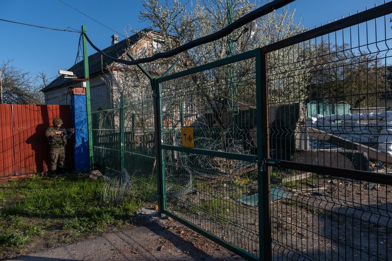 Именно отсюда на киевское направление заходила тяжёлая техника российских военных. Сейчас контрольно-пропускной пункт украинских пограничников брошен. Здесь тоже видны следы обстрелов. Но жизнь за воротами существует: вот кто-то проехал на велосипеде, бегают собаки и, завидев журналистов, вдалеке начинают толпиться люди.