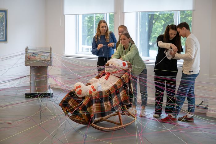 Идея опутать все милые сердцу предметы разноцветными нитями родилась спонтанно. Любой желающий мог привнести в инсталляцию что-то своё. Например, штрих цветной шерстяной нитью. Так на глазах рождается произведение партиципаторного (коллективного) искусства.