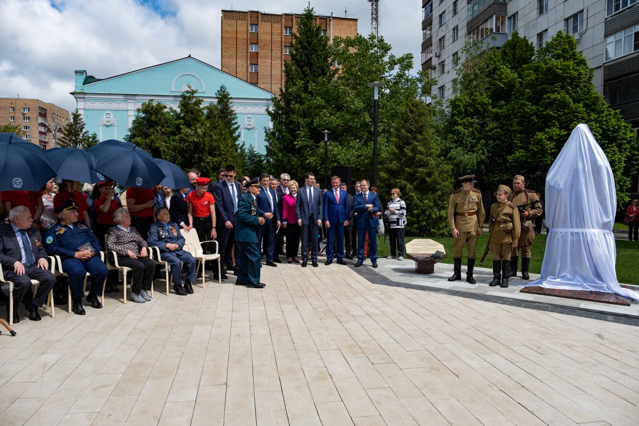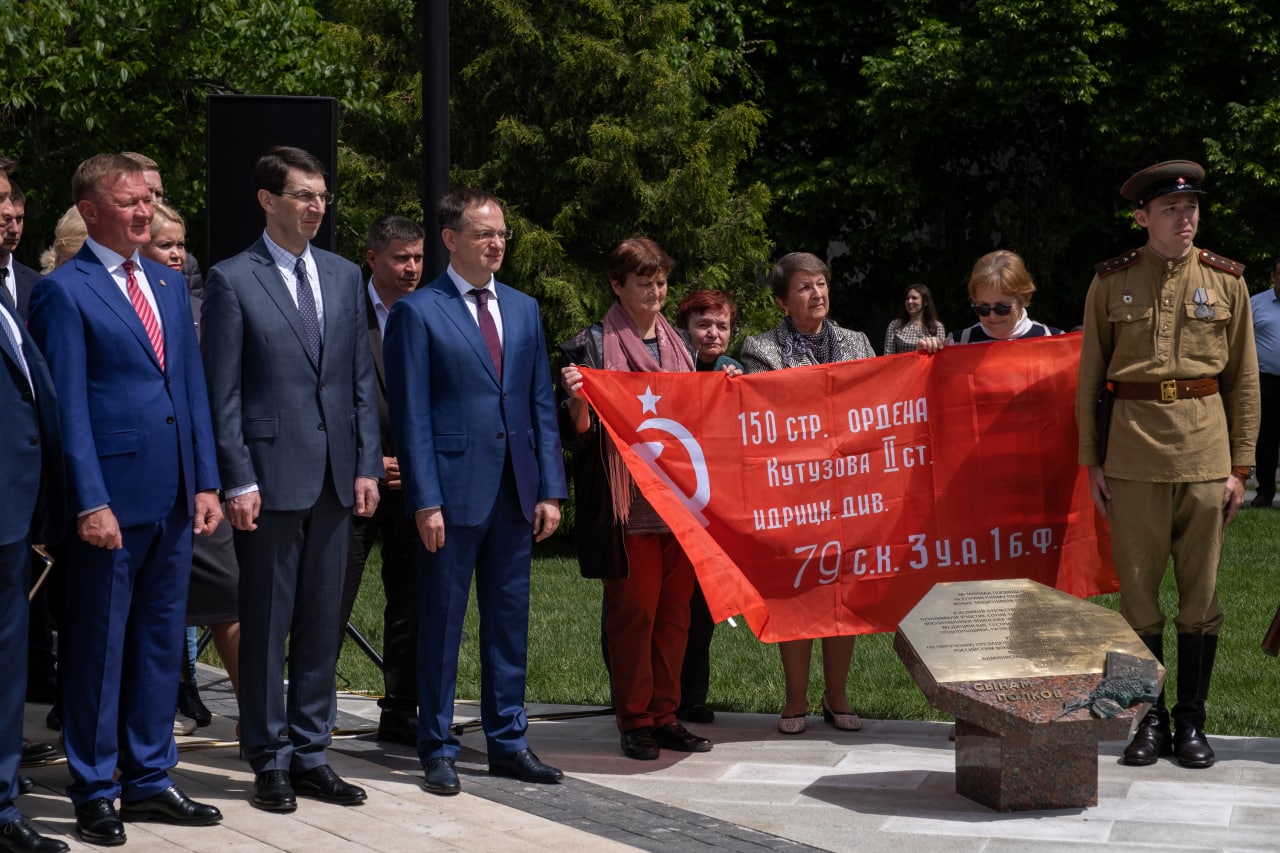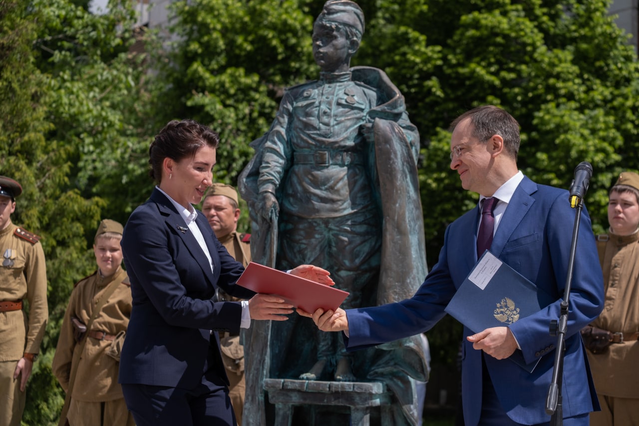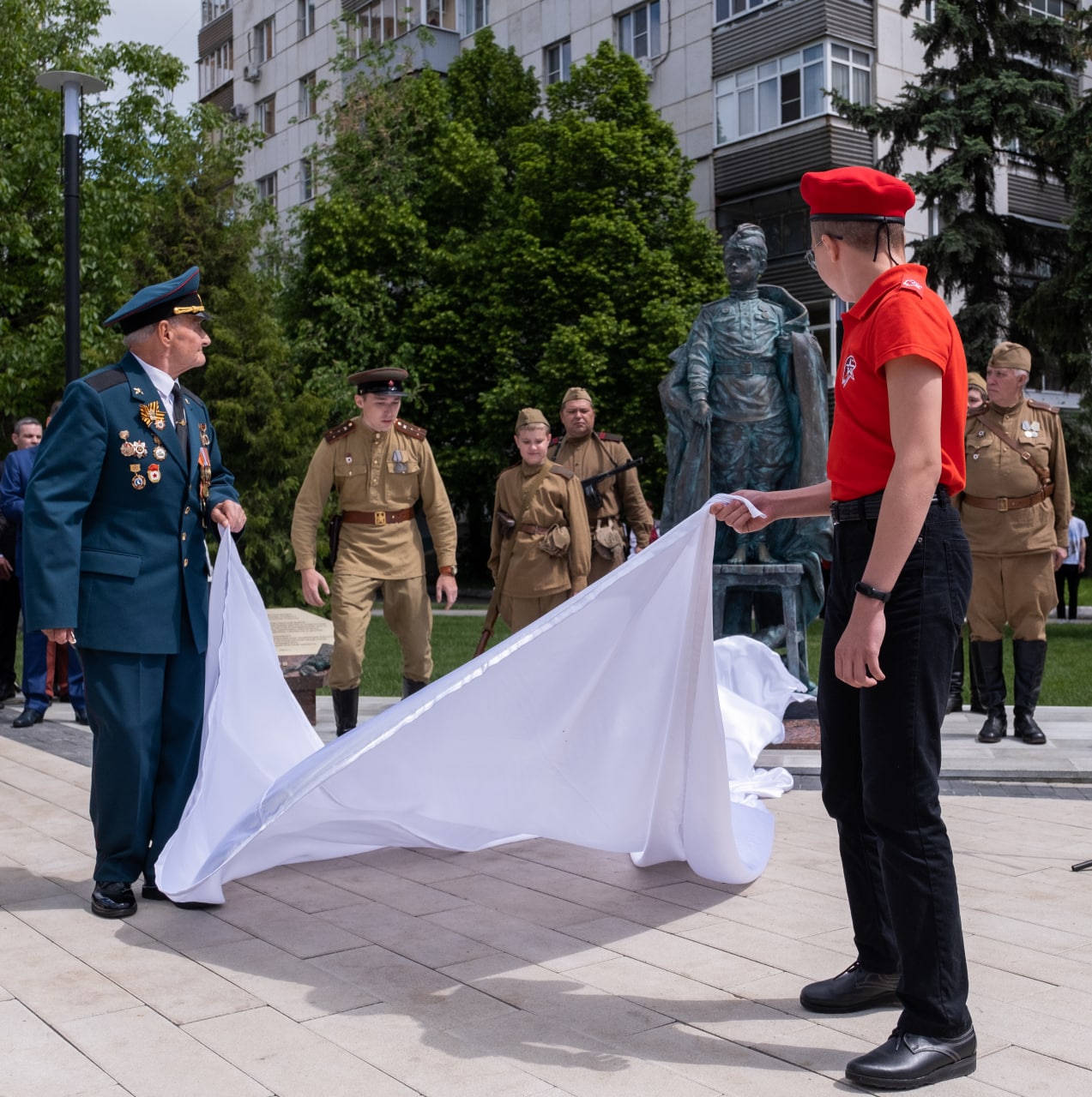 Открыли памятник Николай Константинович Имчук и праправнук знаменитого участника боевых действий за Сталинград, 14-летнего разведчика Алексея Воднева — Михаил. Миша — юнармеец, учится в курской школе №46.