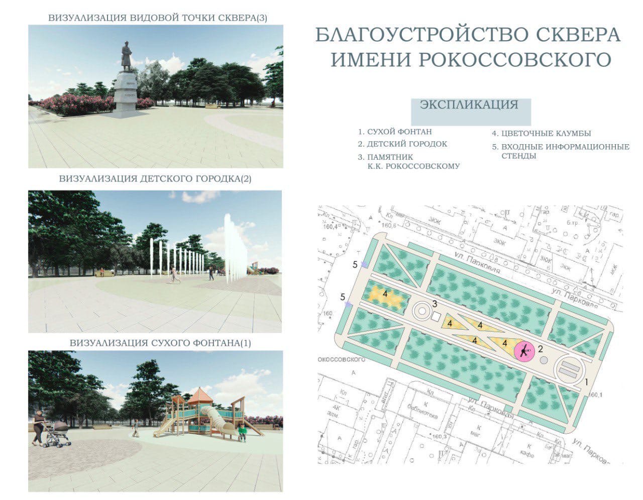 Установить сухой фонтан планируется и в сквере имени Рокоссовского. Здесь появятся также детский городок, цветочные клумбы и входные информационные стенды.