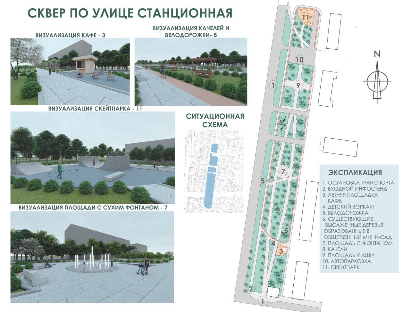 Проект благоустройства сквера на улице Станционной включает несколько зон спокойного и активного отдыха, площадку для детского воркаута, качели, велодорожку, скейтпарк, а ещё площадь с сухим фонтаном и летнее кафе. Кроме этого, недавно высаженные деревьев преобразят в мини-сад. Для удобства гостей сквера оборудуют автопарковку.