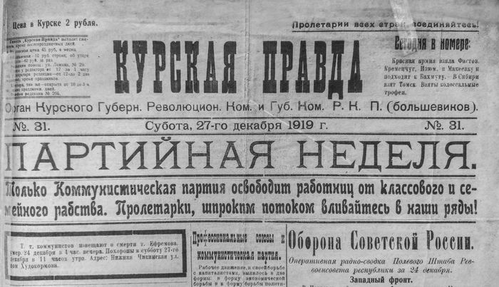 27 декабря 1919 года – «Курская правда» выходит с центральным заголовком «Партийная неделя» на первой полосе. Под ним – красноречивый слоган, целебный бальзам на душу тогдашних феминисток и поборниц равноправия полов: