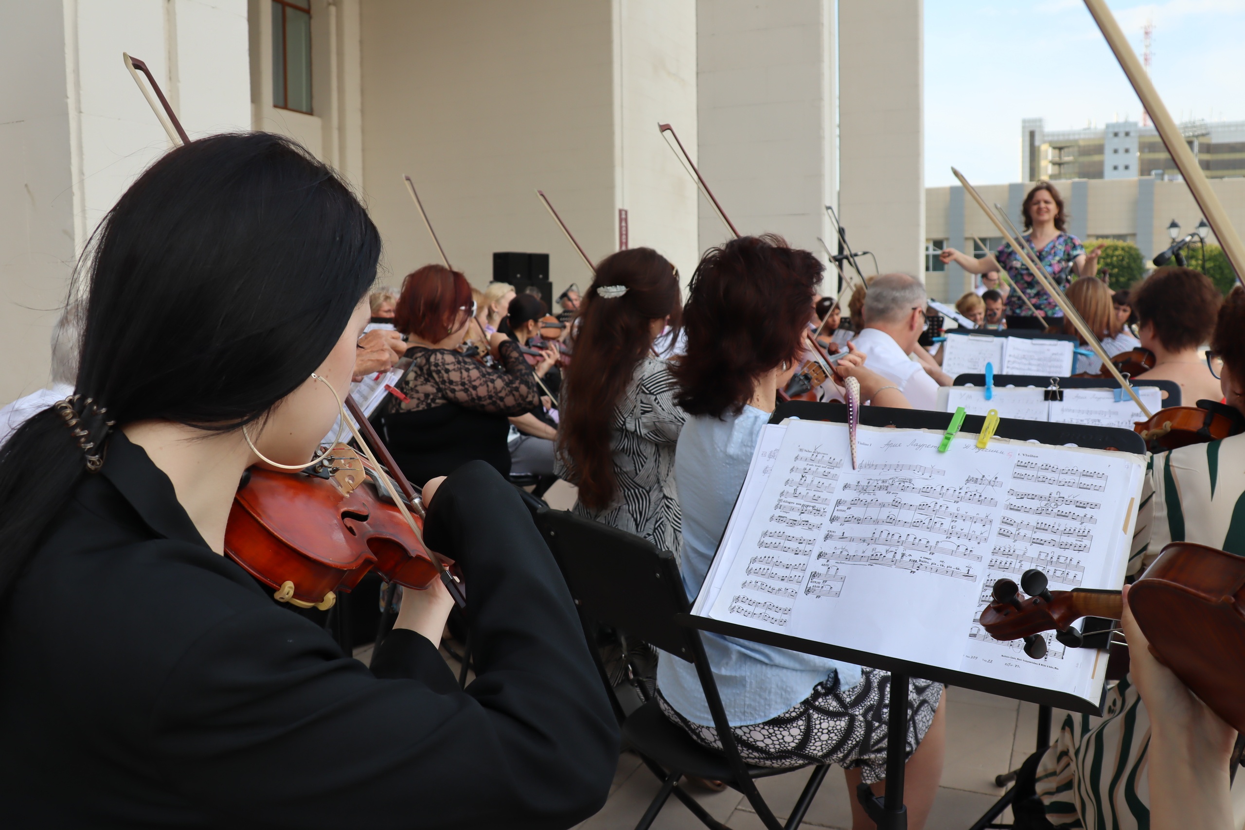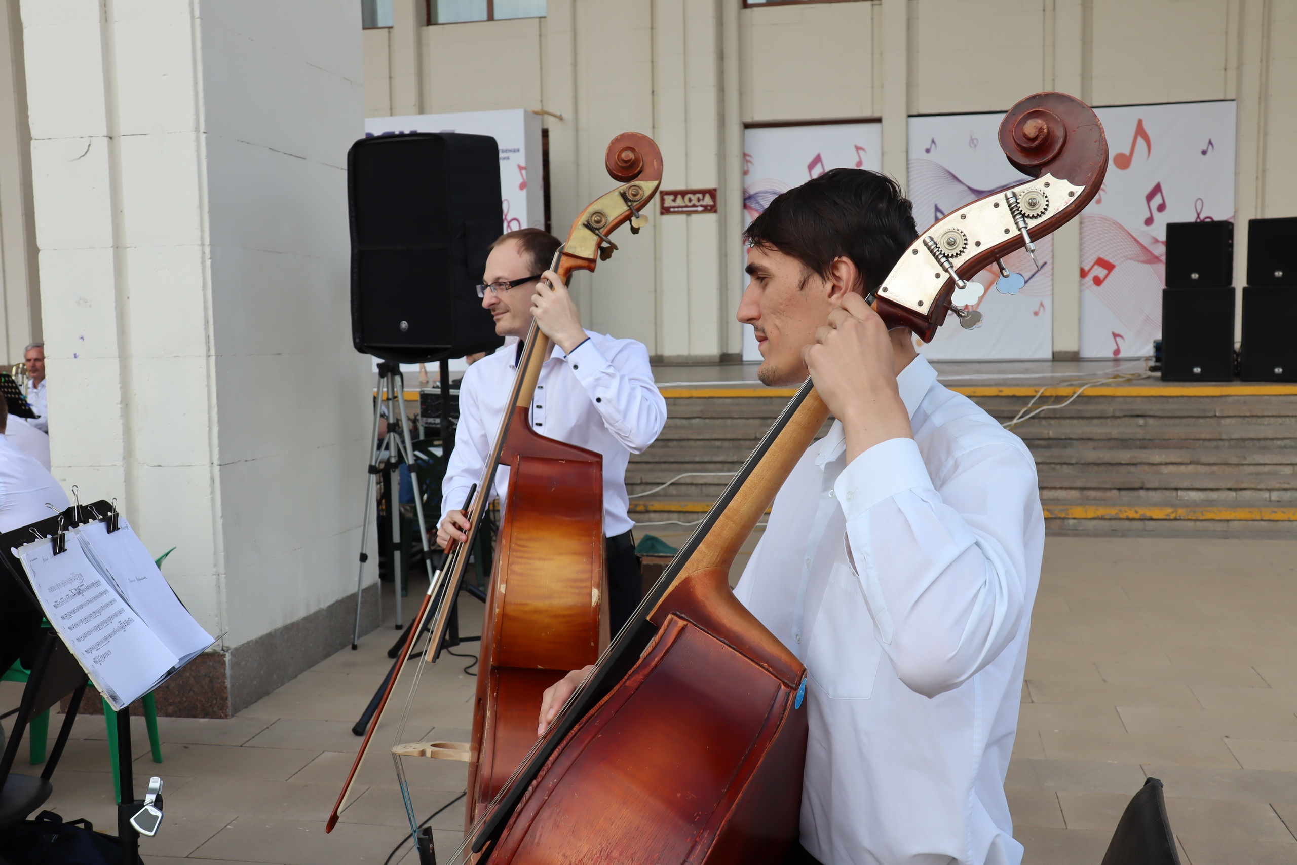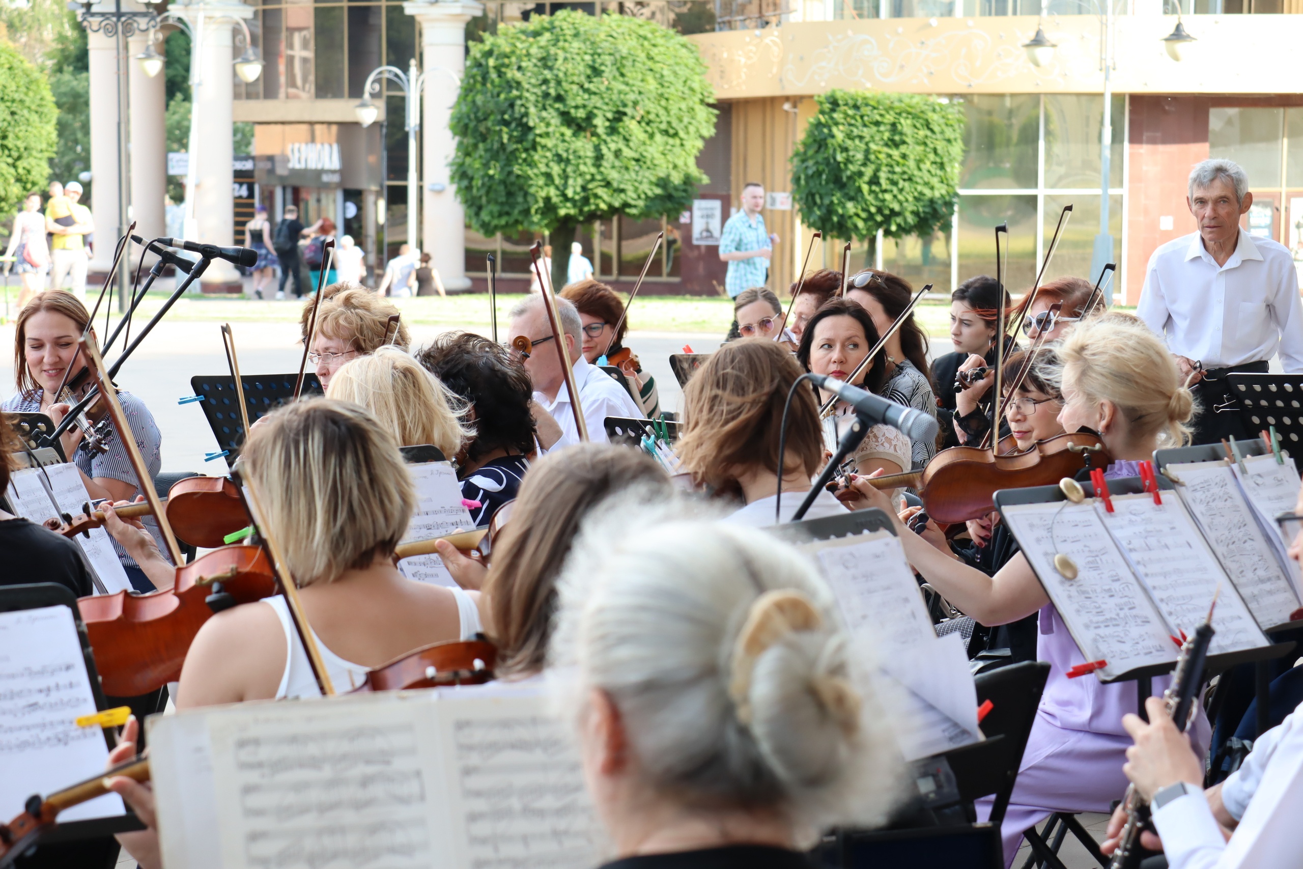 Перед показом на Театральной площади начался концерт симфонического оркестра совместно с солистами филармонии. Звучит музыка Чайковского. Серенаду Дон Жуана исполнил солист Курской филармонии Андрей Капралов.