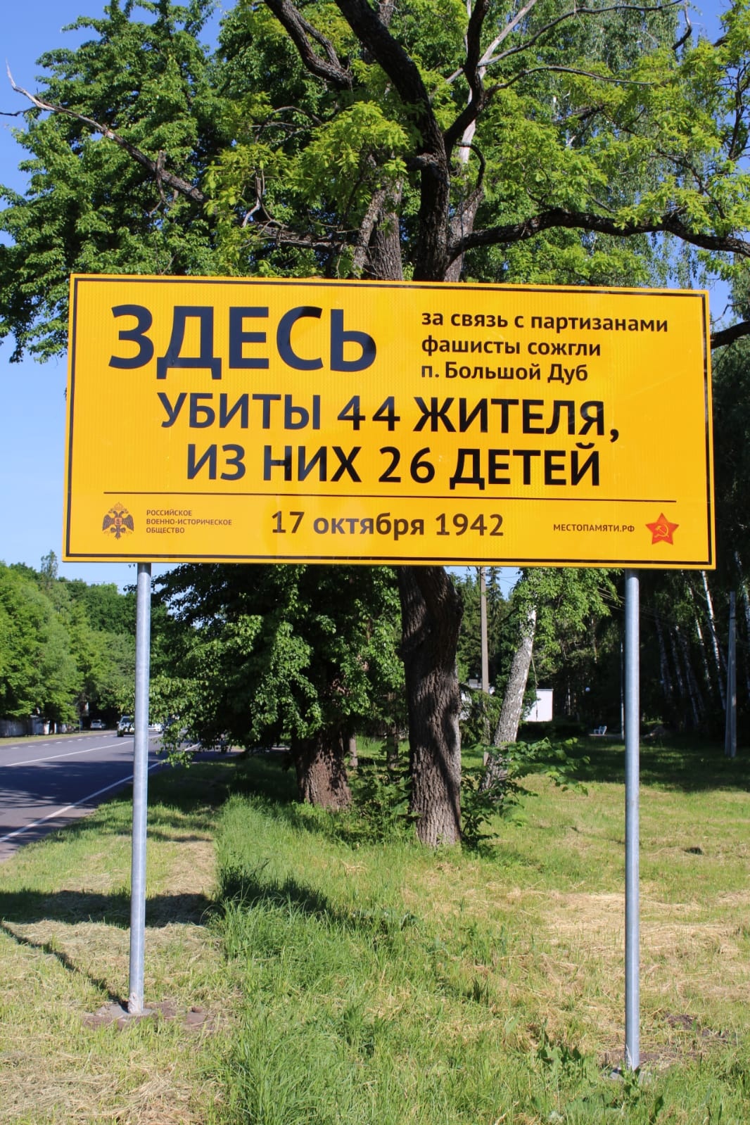 В Курской области уже появился первый такой знак. Его можно увидеть в Железногорском районе на месте, где в 1942 году немецкие фашисты уничтожили посёлок Большой Дуб. 44 жителей этого населенного пункта убили каратели за подозрение в помощи партизанам. Среди убитых было 26 детей. Недалеко от знака находится мемориальный комплекс «Большой Дуб», где представлены материалы по истории партизанского движения в Курской области.
