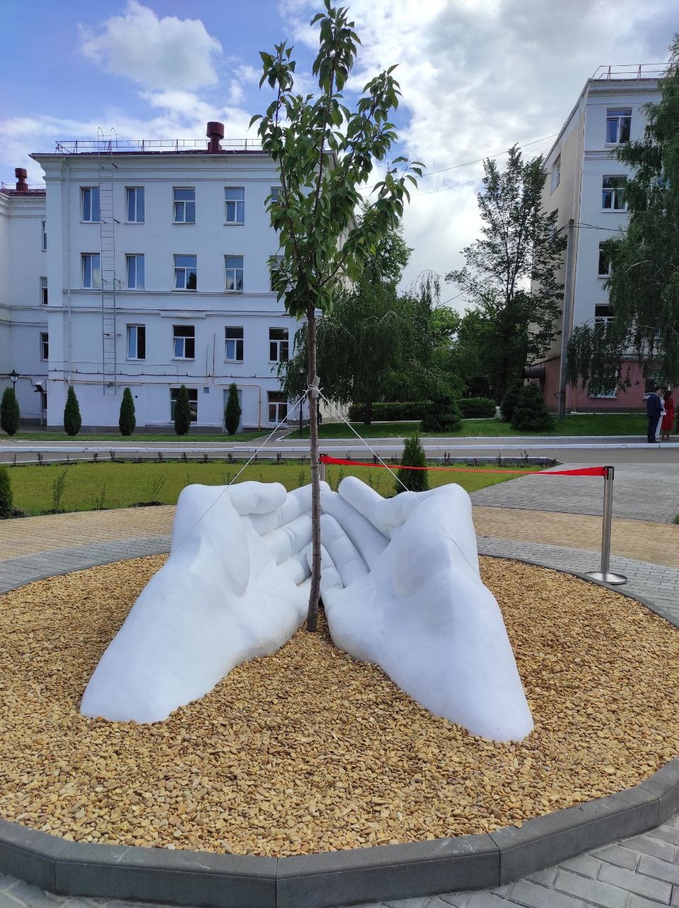 Устанавливать памятник или открывать сквер в праздничные значимые для России и для университета дни стало уже традицией в вузе, говорит ректор КГМУ Виктор Лазаренко. Новая скульптура изображает руки медика, оберегающего символ жизни — саженец вечнозелёной сакуры.