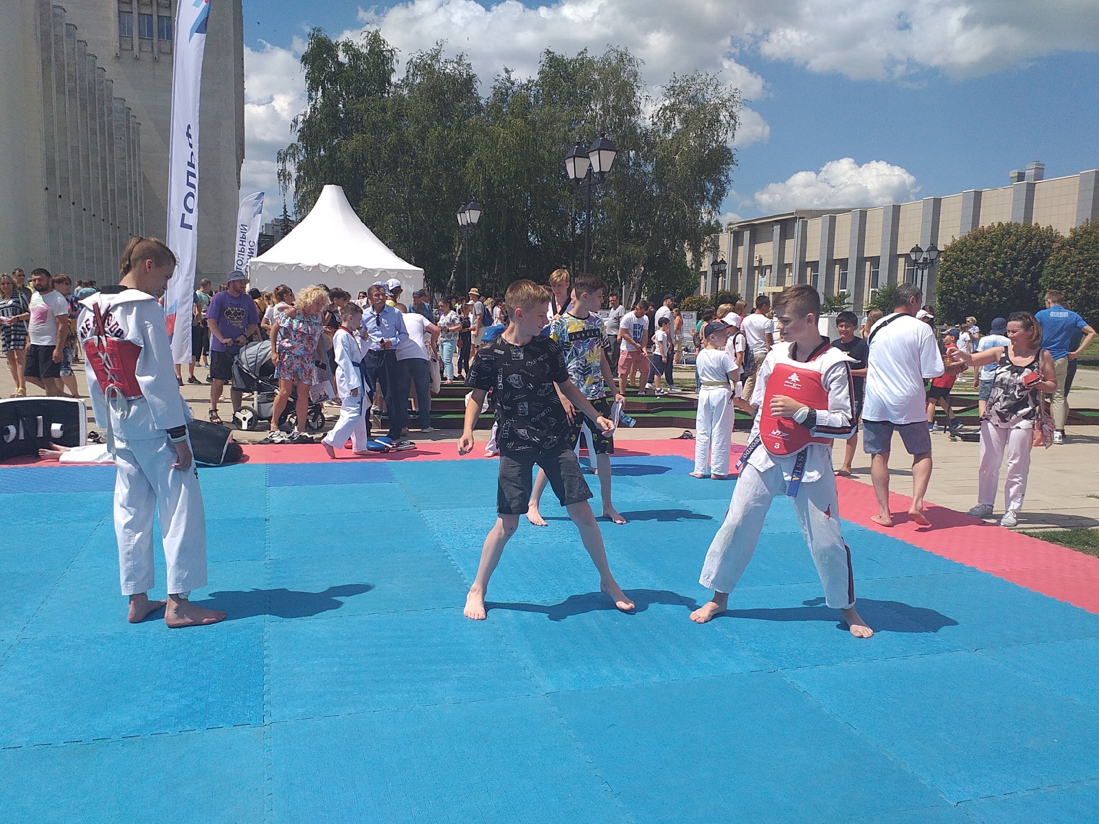 Спортивный городок на Театральной площади открылся с 11 часов. Куряне уже проверяют свои силы в фехтовании, легкой атлетике, хоккее, пулевой стрельбе, тхэквондо, настольном теннисе, гандболе, айкидо и регби.